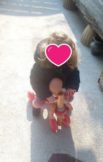 Dès que le temps le permet, nous profitons de l’allée pour nous aérer et promener les poupons. Le toboggan a repris du service.
