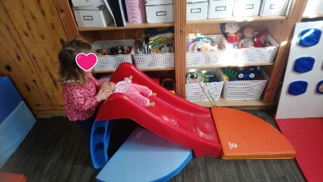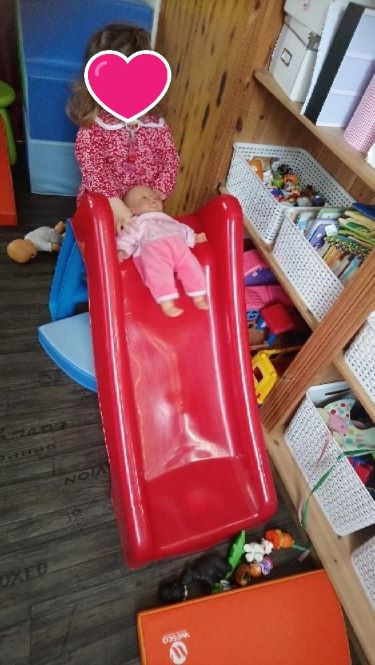 Ce n’est pas parce que l’on ne fait pas de sorties à l’extérieur qu’on ne bouge pas. Tatie a installé un toboggan dans la salle de jeux.