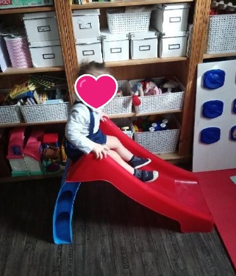 Ce n’est pas parce que l’on ne fait pas de sorties à l’extérieur qu’on ne bouge pas. Tatie a installé un toboggan dans la salle de jeux.