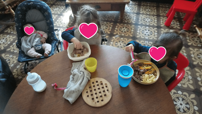 Puis après un joli rôt, j’installe la benjamine dans le transat pour m’occuper des plus grandes. Tout ce petit monde est installé autour de la table pour un moment de convivialité.