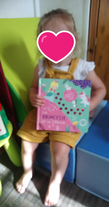 Il s’agit de la Princesse et d’une licorne. Tout au long des pages, nous pouvons suivre les empreintes de pas d’un animal avec les doigts.