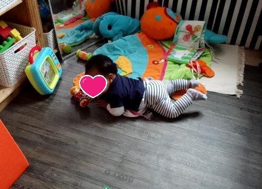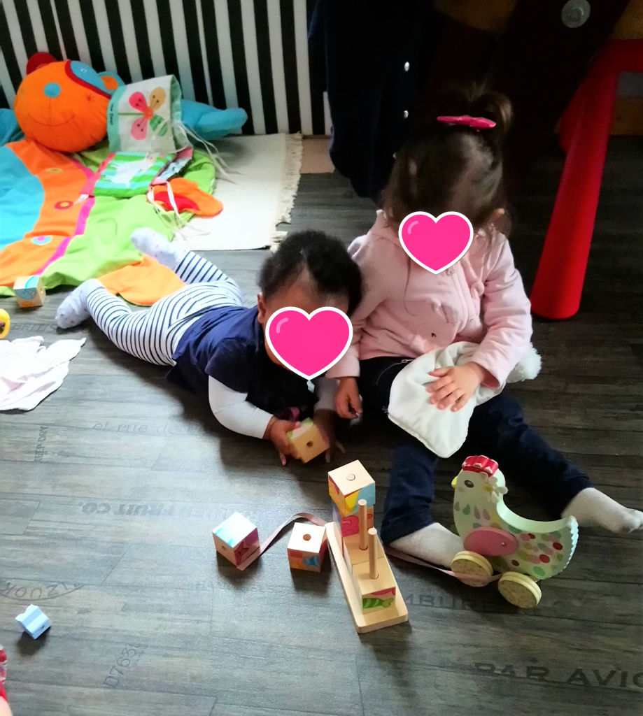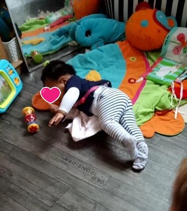 Que de progrès pour Romane. Elle commence à maîtriser le recto -verso (retournement ventral dorsal) et elle arrive à se mouvoir pour commencer à explorer autour du tapis d’éveil .. Je continue à disposer autour d’elle des jouets pour éveiller sa curiosité..