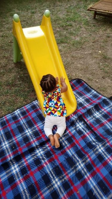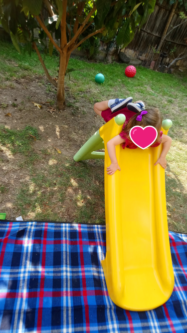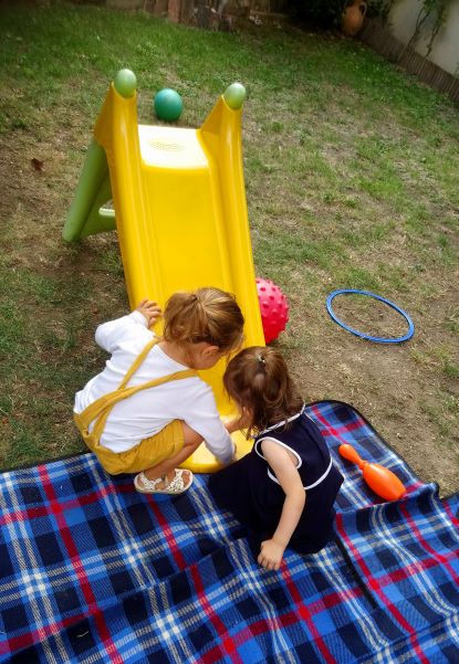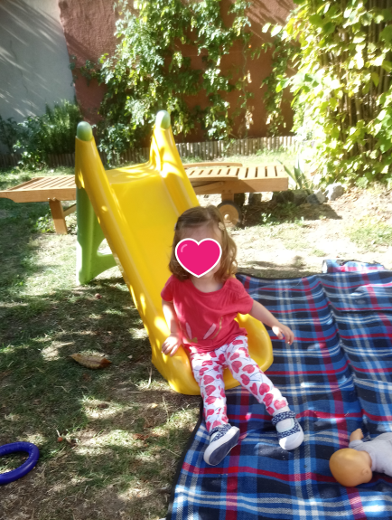 Comme il fait encore beau, j’ai laissé le toboggan en place. Les grandes sont très férues de ce jeu. A l’envers , à l’endroit peu importe, du moment que l’on respecte le tour de la copine.. Pendant Romane et moi les admirons..