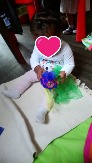 Je les incruste dans la balle, je laisse dépasser quelques bouts pour pouvoir les attraper. Romane découvre son nouveau jouet. Elle est intriguée par ces morceaux de tissu .Elle tire dessus; les touche. Des nouvelles textures toutes douces et colorées.