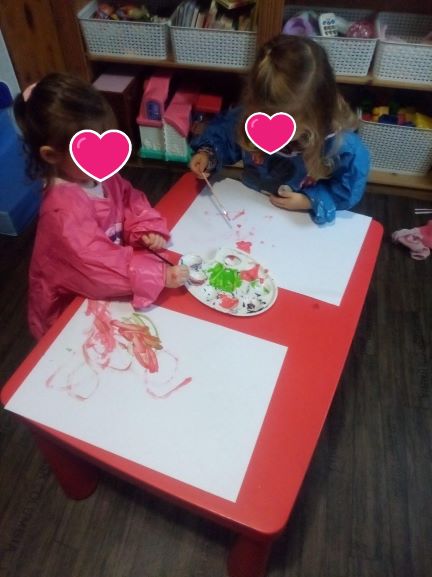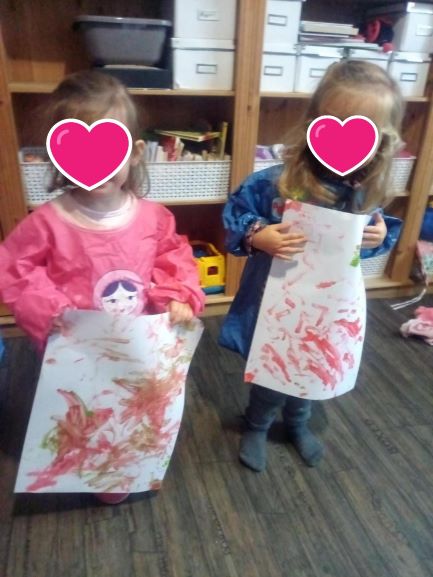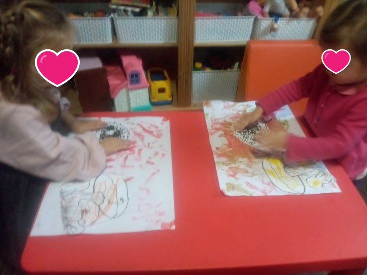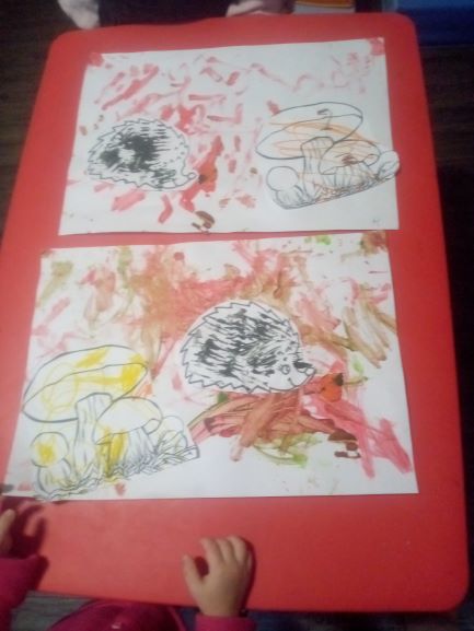 Ensuite Elisabeth et Romy se sont amusées à peindre à la fourchette pour faire des piquants à l’hérisson . ( et là dommage un lutin farceur a fait disparaitre les photos..) Heureusement chacune a pu raconter son plaisir de l’activité aux parents.