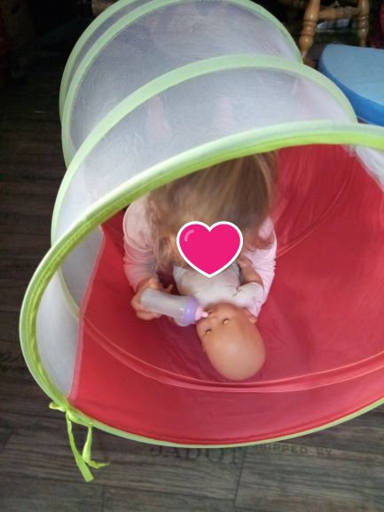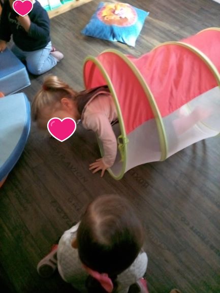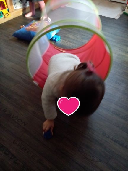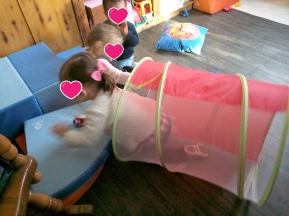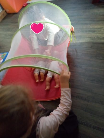 Pour cette matinée , j’ai choisi de sortir ce jouet. Toutes l’ont apprécié !! J’ai eu le plaisir de les voir s’amuser avec les poupons, les voitures.. Et même Romane … »tatie regarde … »