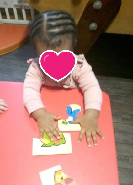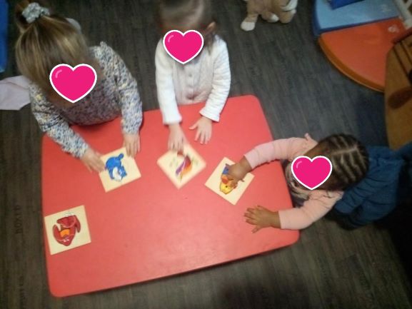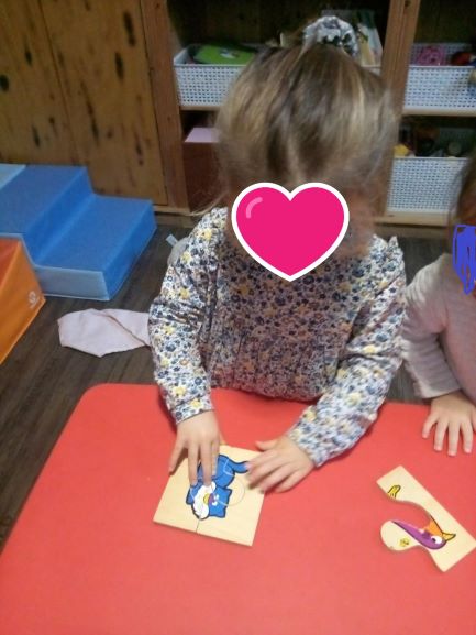 Dans un premier temps ,je leur ai montré le jeu complet puis j’ai commencé à compliquer les choses. D’abord une image chacune puis je rajoute deux images ensemble à trouver.. Et pour finir j’ai mélangé toutes les pièces sur la table pour voir leurs réactions.