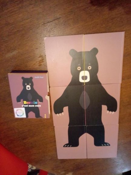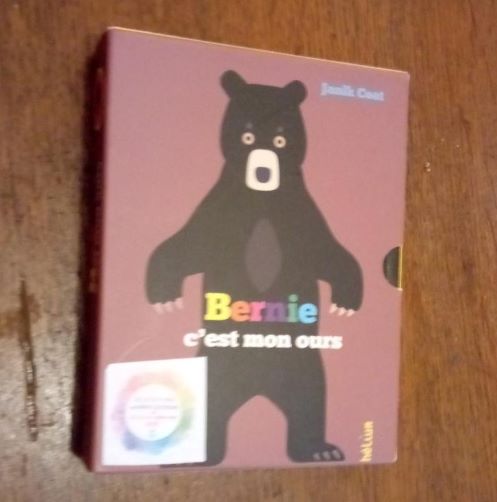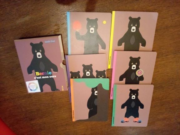 Nous avons commencé par BERNIE. C’est un coffret regroupant des petits livres sur plusieurs thèmes.( couleurs, vêtements , moyens de transport..) Les phrases sont courtes et simples avec un vocabulaire adapté. Ils sont facilement manipulables ( format A5 et cartonnés) Quand tout est lu, les livres reforment un grand Bernie !