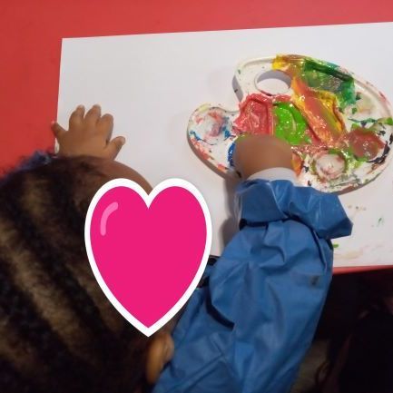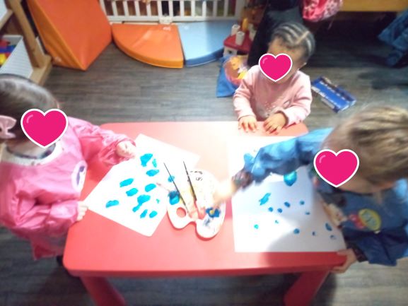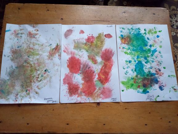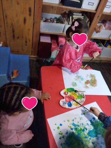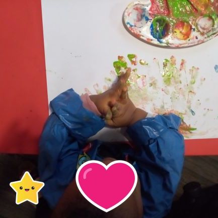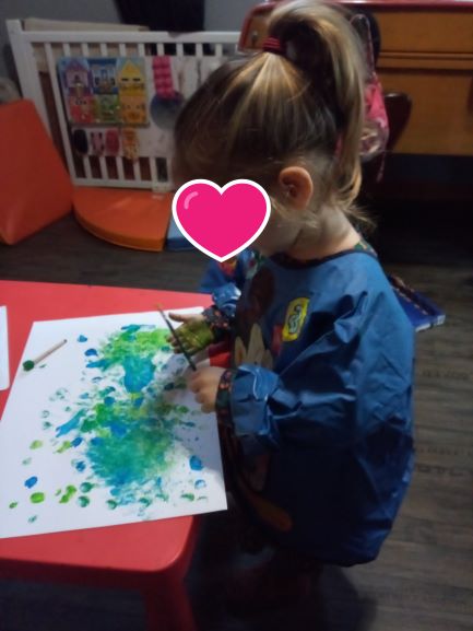 Romane a suivi . Elle a plongé les doigts dans la peinture. Elle a pu ressentir la matière en se frottant les mains. un joli festival de couleurs… Elisabeth et Romy ont applaudi notre jeune artiste en herbe. ( un super moment de complicité)