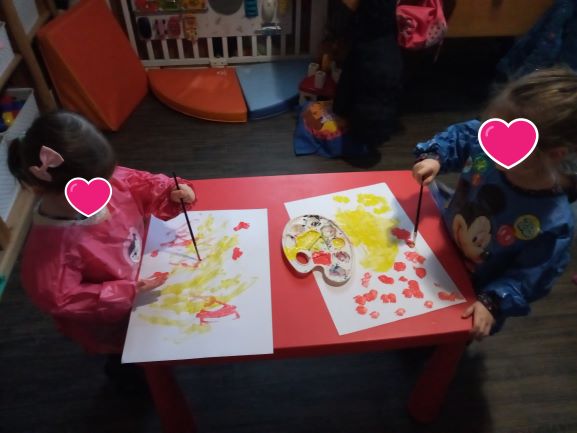 Nous avons commencé par sortir les pinceaux. Elisabeth et Romy ont enfilé les tabliers. Elles se sont bien amusées.