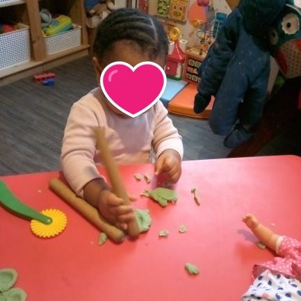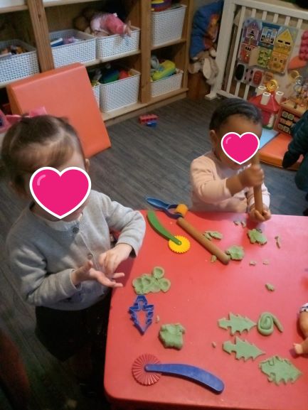 Elisabeth et Romane étaient très motivées pour un atelier pâte à modeler. (Romy en vacances avec ses parents) Même le poupon a participé avec l’aide de la grande. C’est amusant de voir chacune s’approprier cette matière. l’une la malaxe dans tous les sens (découverte) et l’autre est déjà dans la transmission de l’apprentissage…