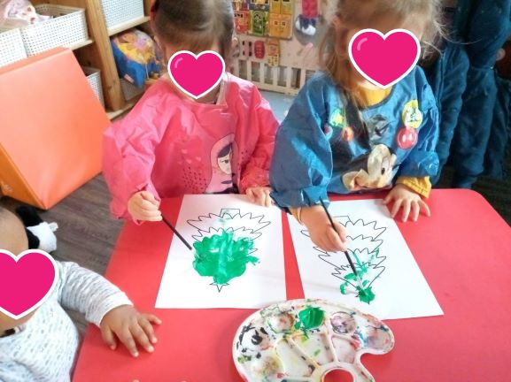 Nous continuons notre travail sur les couleurs. cette fois ci c’est avec la peinture… Elisabeth et Romy apprécient beaucoup de se servir des pinceaux (ce sont les grandes…) Romane préfère tamponner.. Les gestes se font de plus en plus précis avec l’âge .