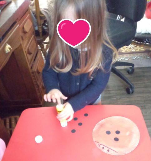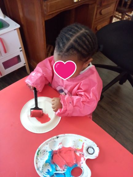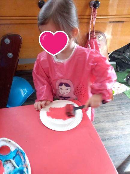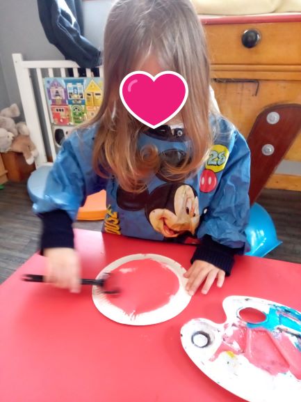 Peindre une assiette en carton avec des rouleaux… tout le monde y passe ..chacune est concentrée. Elisabeth et Romy commencent à peindre puis c’est le tour de la benjamine.. Romane a le droit aux encouragements des copines.
