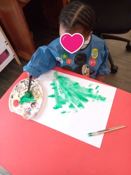 Ensuite peindre l’herbe au pinceau et rouleau pour la plus petite .. J’adore quand je les vois toutes installées autour de la table, les plus grandes commençant, Romane observe .Elle sait que je vais l’accompagner après pour qu’elle puisse refaire à sa manière.