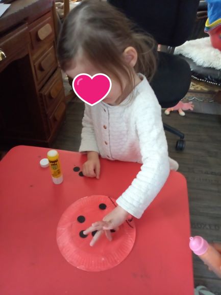 Ah ce n’est pas facile de coller les ronds noirs sur le dos de l’animal Ensuite il faut assembler le tout. Quelques soucis avec les gommettes papillons, elles s’envolent toutes seules !!
