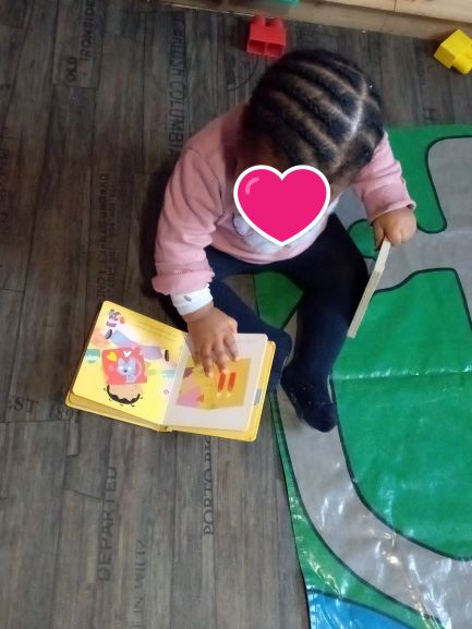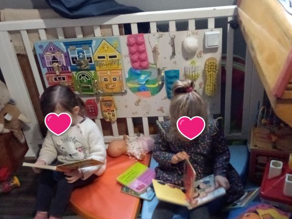 Depuis le début de mon accueil, j’ai installé une caisse avec des livres en libre service pour les enfants.. Les plus grands initient les plus petits à s’approprier les histoires, à tourner les pages.