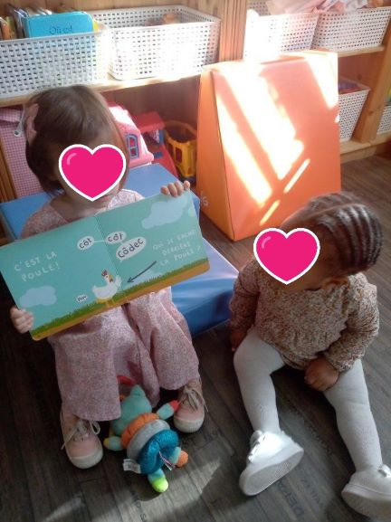 Nous avons pu retrouver certains animaux de la ferme. Nous avons aussi rencontré un tout petit petit fermier….. Les demoiselles ont bien ri avec ce livre…Elisabeth vous montre une des pages, Romane adore .