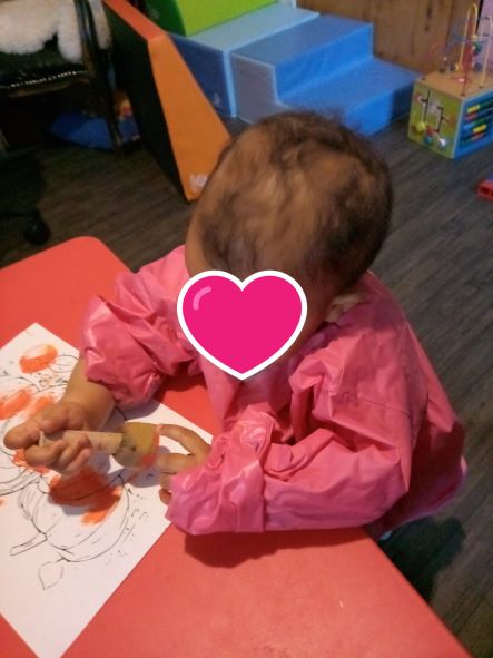 Cela signifie aussi en motricité fine de commencer à tenir le crayon pour la benjamine.. Mais surtout d’imiter Romane et Taila avec les tampons de peinture..