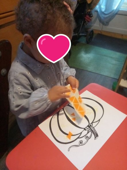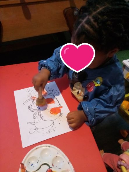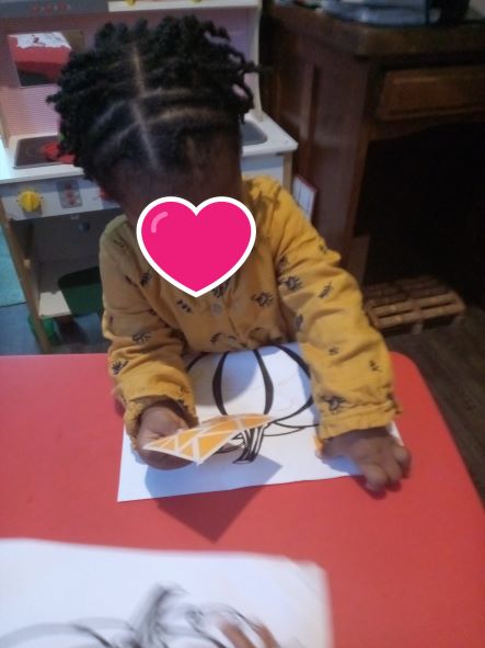 Entre le coloriage et la peinture..et même quelques gommettes… je commence à aborder la couleur orange…