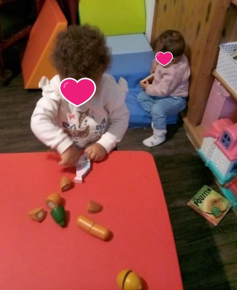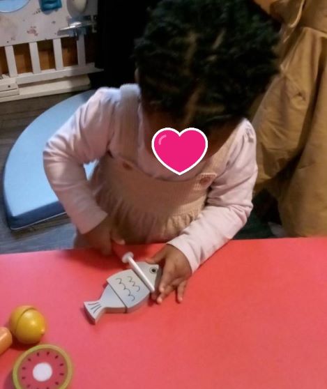 Du coup nous avons enchainé sur les autres aliments banane, croissant, poissons, pilon de poulet pour apprendre le maniement du couteau. Romane a adore, Thaissa a observé et a choisi de s’installer pour lire.