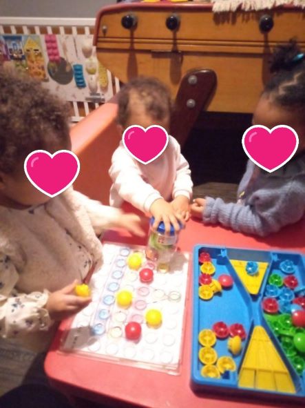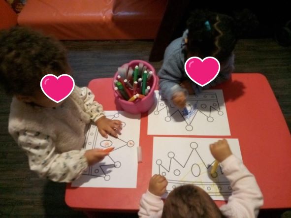 Il y a les traditionnels coloriages toutes les 3 ensemble… prendre le temps de les observer …et …Taila commence à différencier les divers éléments, Romane dessine des ronds..