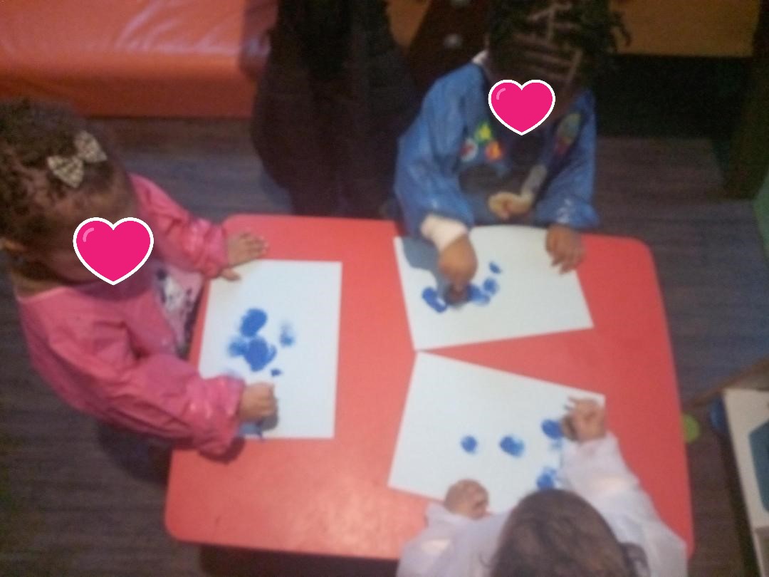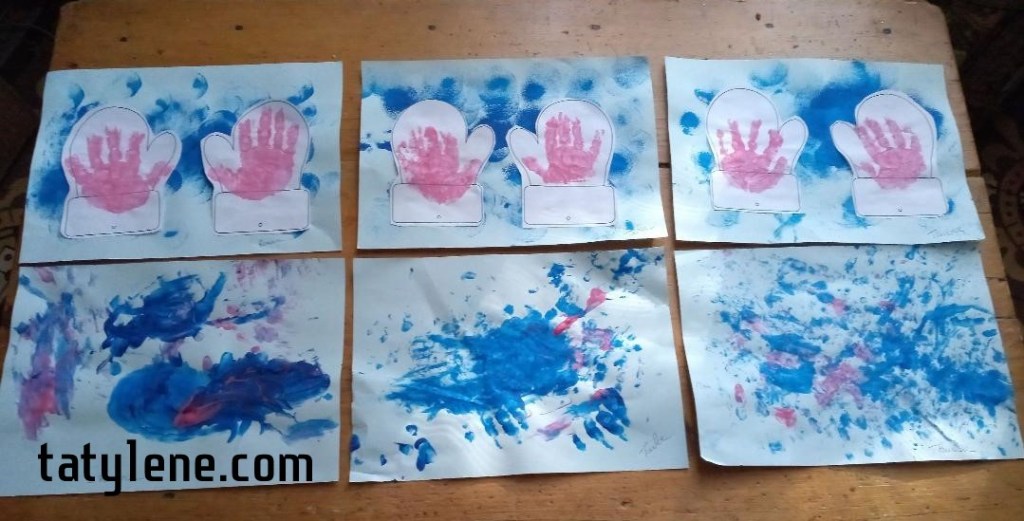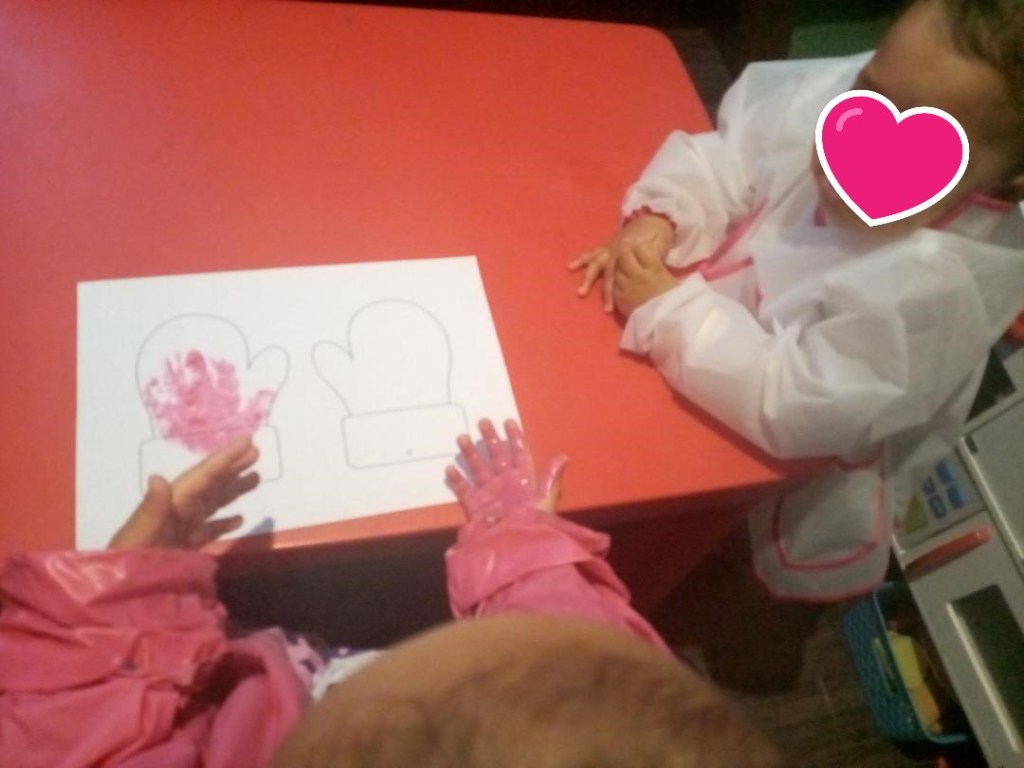 Tatie a coloré les mains et chacune a marqué sa paire de moufles.