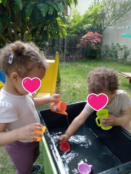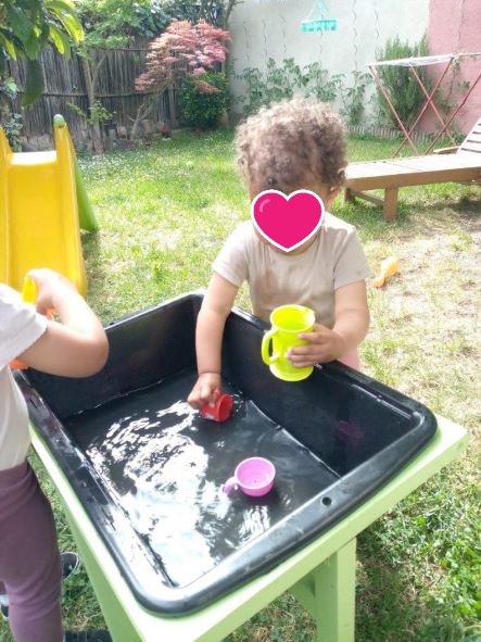 Il fait chaud c’est le moment idéal pour les jeux d’eau . J’ai rempli le bac et fourni à Taila et Thaissa des récipients pour expérimenter les transvasements Elles se sont vraiment amusées avec l’eau. Heureusement il y a les tenues de rechange dans le sac !!