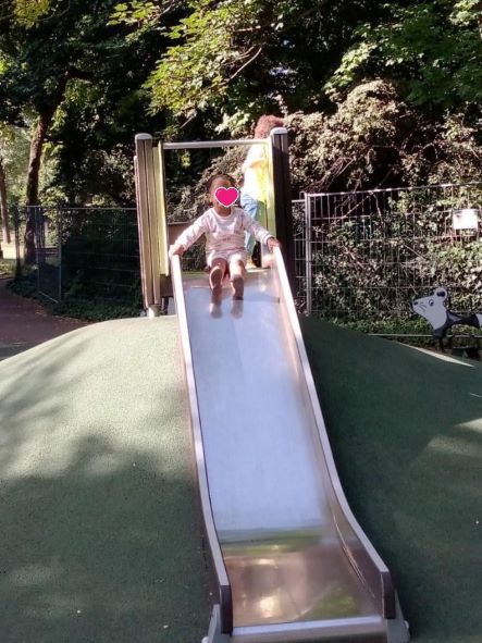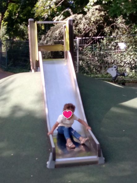 Le toboggan. Ouh là un peu plus compliqué pour y grimper.. il n’y a ni échelle ni marches, c ‘est une pente plus ou moins prononcée selon le côté. Pas facile mais les demoiselles ont réussi à trouver comment faire.