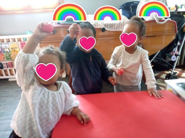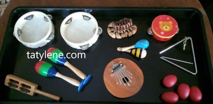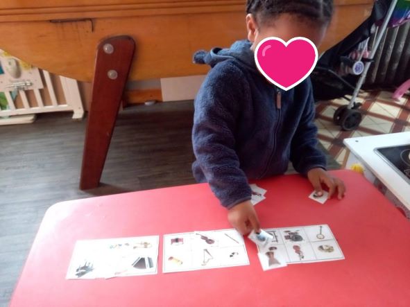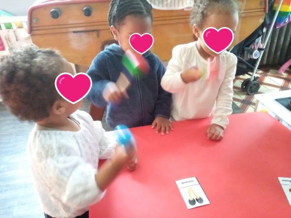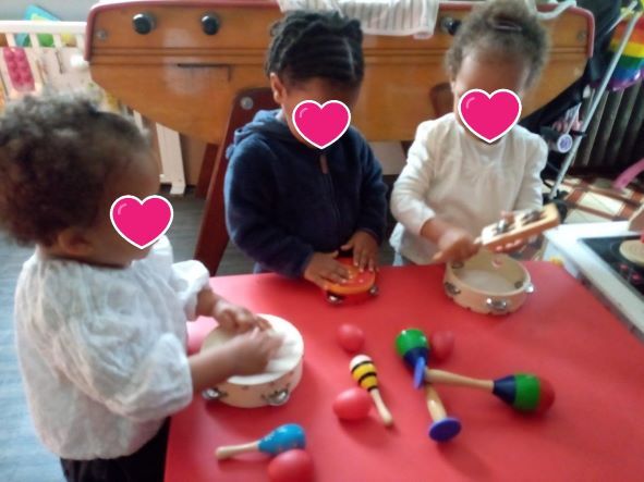 Nous commençons par nommer les instruments et les tester. Certains sont déjà bien connus grâce aux ateliers musicaux du relais (maracas, œufs, les tambourins…)