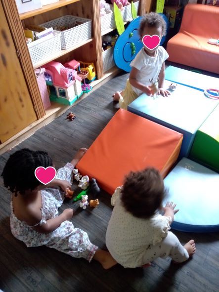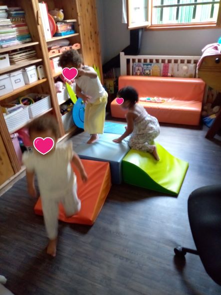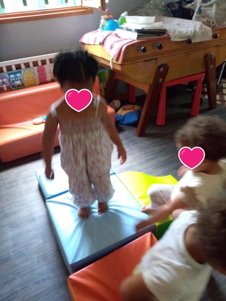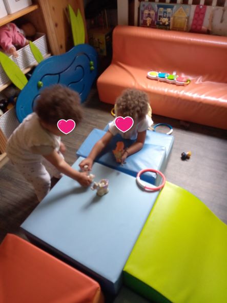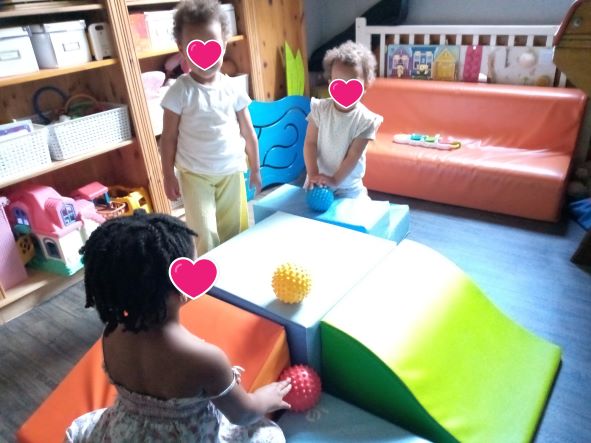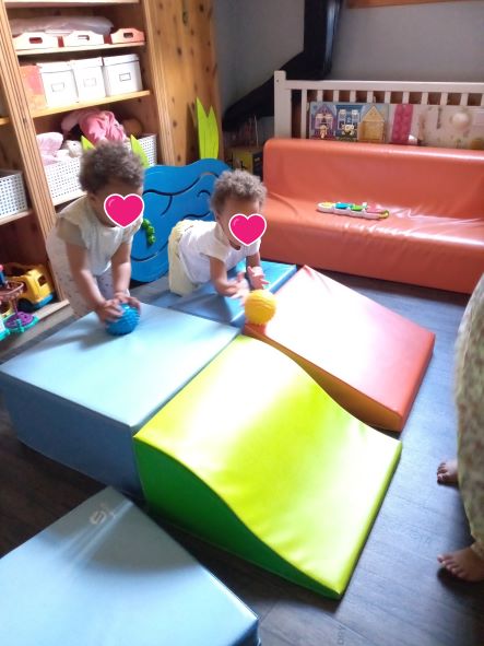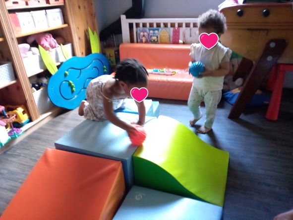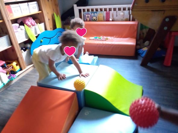 Taila est arrivée un matin plutôt fatiguée, elle avait eu un vaccin la veille donc la matinée avait été calme. Par contre après le gouter, il y avait comme une « envie » de bouger. Les filles m’ont fait comprendre qu’un parcours de motricité sera le bienvenu.