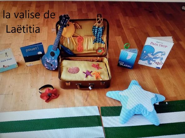 Laetitia nous a fait découvrir sa valise …. Elle propose des animations avec son bagage…dedans il y a une très belle couverture avec des cachettes., .(cousue main, je vous assure qu’il y a un sacré travail). des personnages en crochets, des livres, des décorations.. des supports à lecture et comptines….