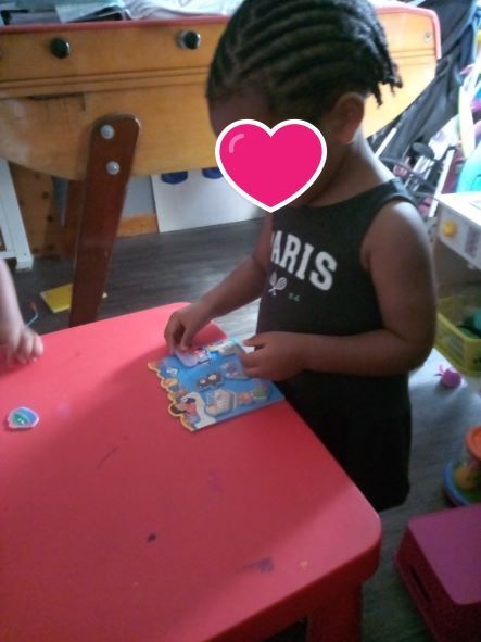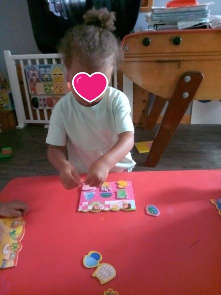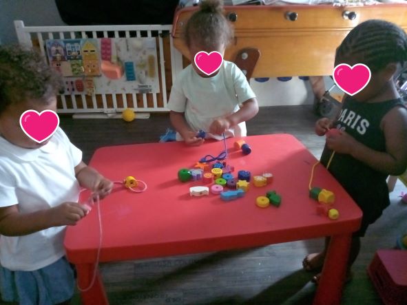 Mais aussi des perles en bois (pas toujours facile d’enfiler le fil mais on essaie et à force ça prend forme.)