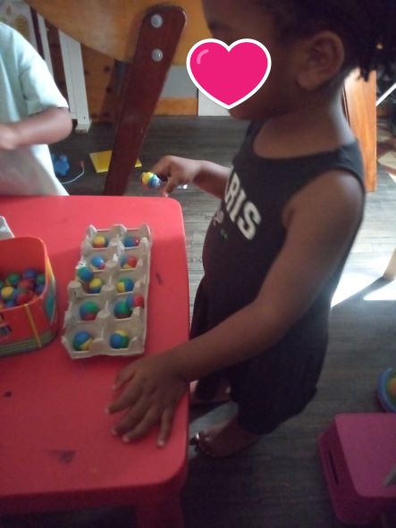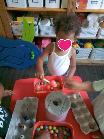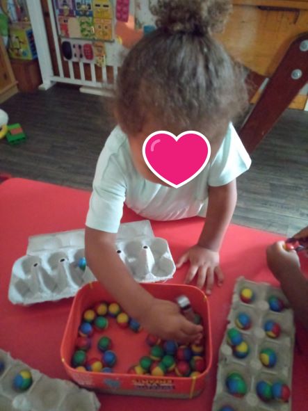 Les demoiselles ont redécouvert le plaisir des transvasements . J’ai ressorti la boite magique avec les balles, les contenants, les pinces et les cuillères.. cela demande un peu de concentration. Romane et Taila sont assez agiles, Thaissa progresse de plus en plus .