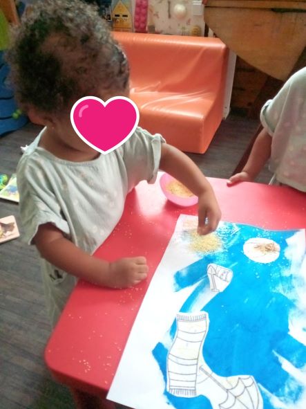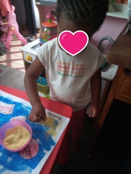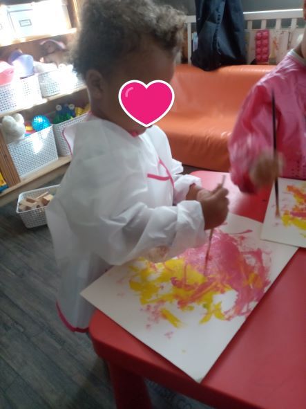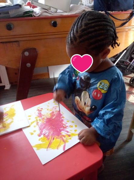 Alors Tatie a sorti la peinture ..Romane, Taila et Thaissa ont enfilé les tabliers. Elles ont commencé d’abord par une œuvre très colorée.