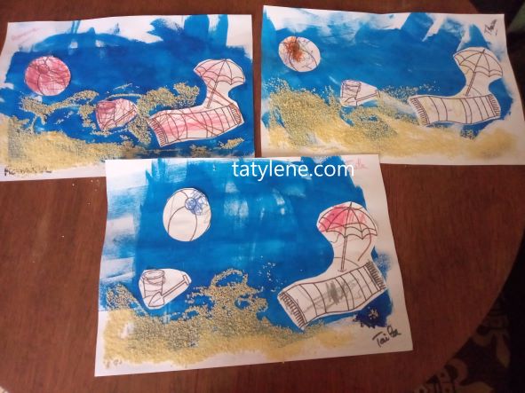 Ensuite nos artistes ont peint un fond bleu ,colorié des ballons, des serviettes, des parasols et bien sur le seau et la pelle…