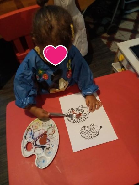 Ce matin lors de notre activité, elle a pu peindre petit hérisson en trempant la fourchette dans la couleur marron pour faire les « piques »