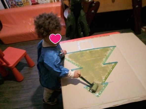 Tatie a récupéré des grands cartons, à l’aide de masking tape ( alors pour ceux qui me connaissent bien j’adore ces petits rouleaux ) j’ai tracé des sapins.