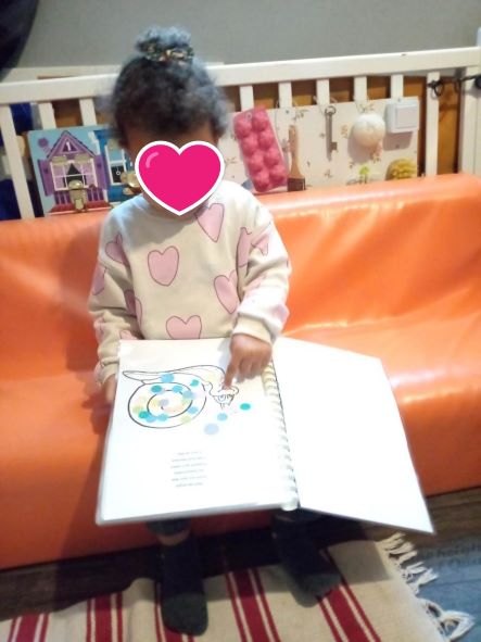 La demoiselle est toute fière, elle a réussi à finir son livre des comptines. Elle a décoré chacune des pages : coloriage, gommettes, collage.. amusant à faire.