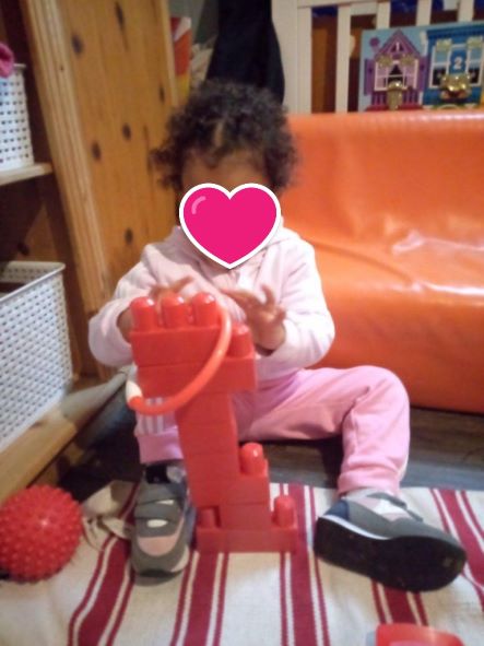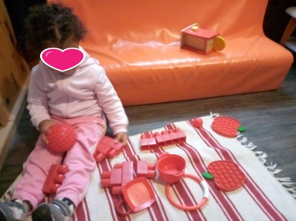 Je lui propose de m’aider à retrouver des objets de cette couleur dans la pièce aussi bien dans les légos que dans la dinette. il y a des trésors !