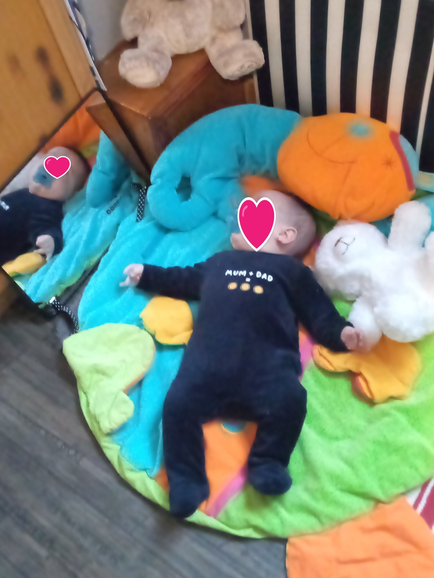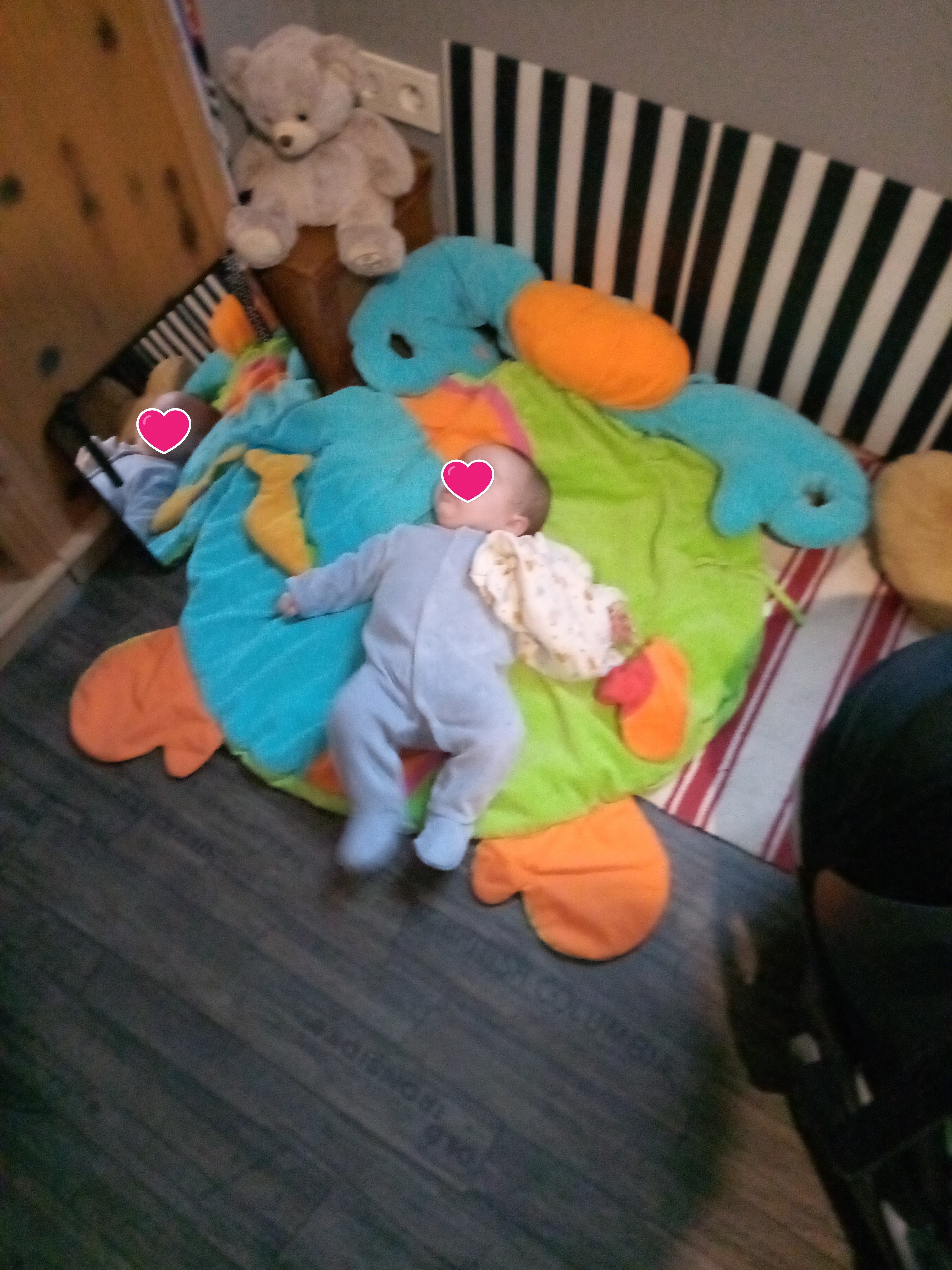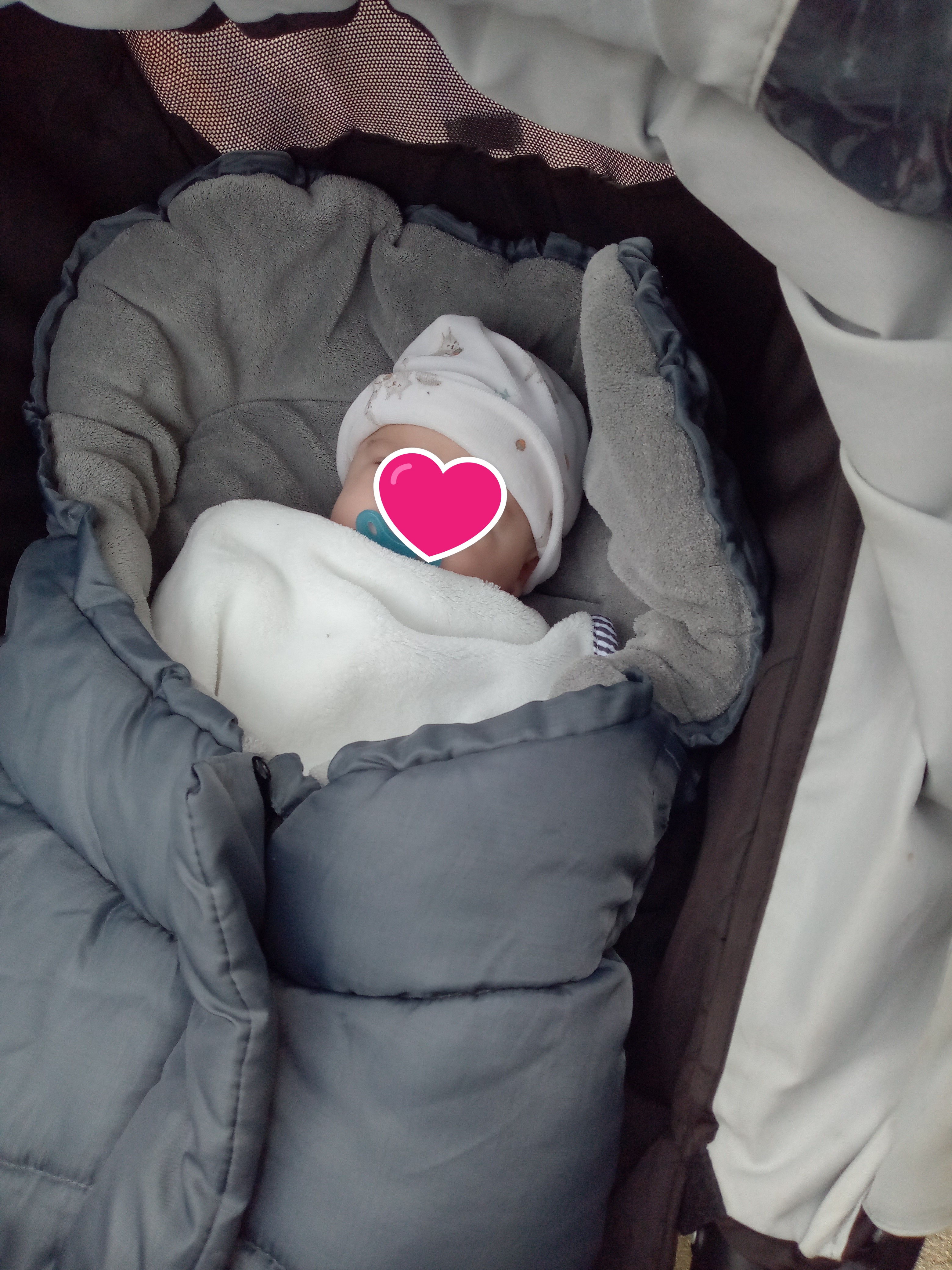 d’abord le coin spécial pour Lucas avec le tapis d’éveil et surtout le miroir. Puis la balade en poussette (un vrai cocon au chaud)