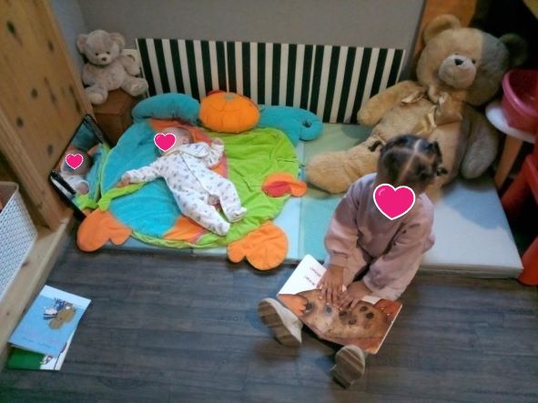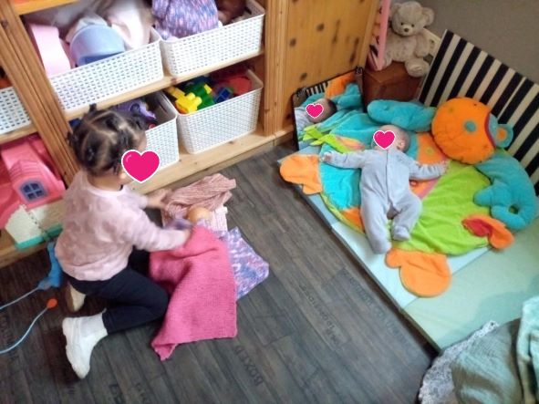 Lors d’un moment de jeu libre, j’ai observé la grande demoiselle installer son poupon après avoir donné un biberon tout près du coin de Lucas. Et pendant ce temps le benjamin écoute, observe et gazouille