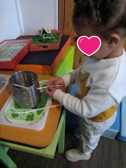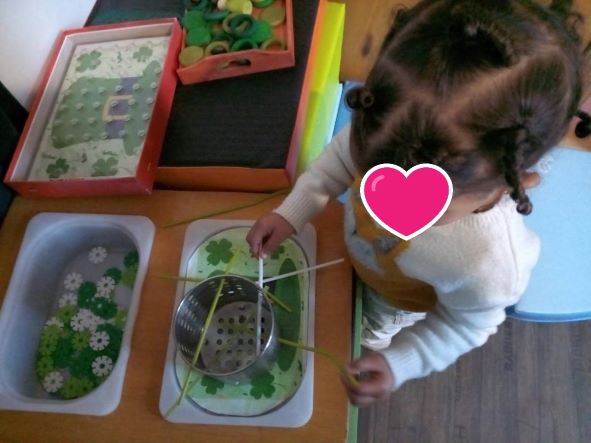 Thaissa a continué avec les pailles à enfiler dans l’égouttoir… ensuite j’ai adapté une image spécifique pour le « colorino » avec des pions verts et jaunes., sans oublier le plateau des personnages et anneaux en bois à manipuler pour le plaisir