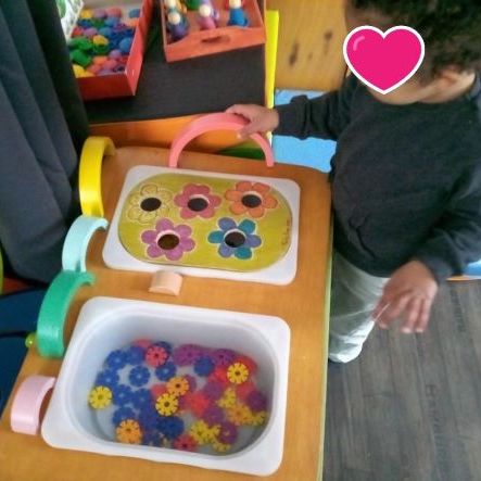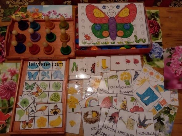 Au programme, les bonhommes en bois, les lotos, les images (vocabulaire + classer du plus petit au plus grand, pareil ou non), l’image à recouvrir avec les jetons, et le dernier arrivé le bac à transvaser… (customisé selon le thème)