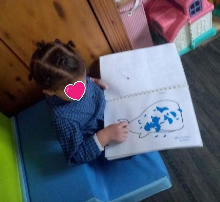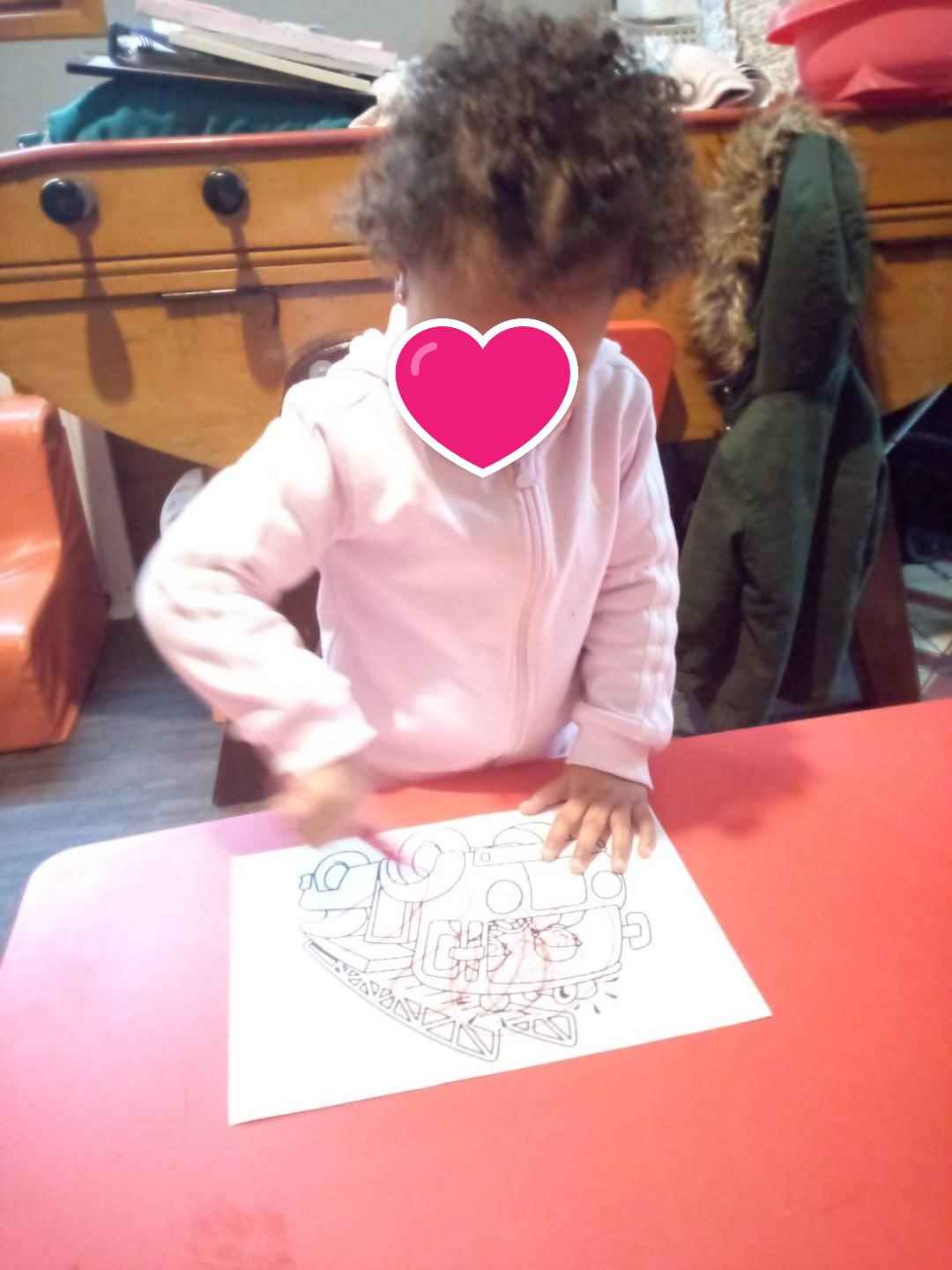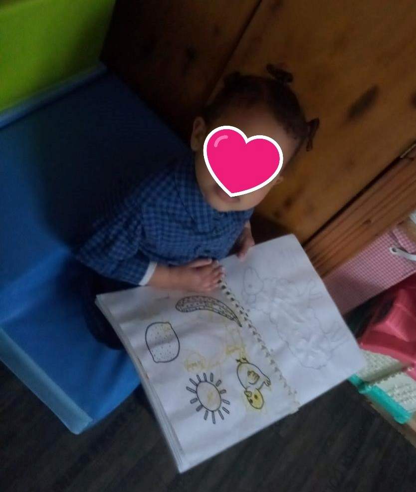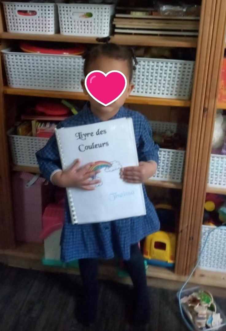 Elle y a mis toute sa joie de vivre en décorant les images, certaines en coloriant, d’autres en collant des gommettes et les dernières avec du playmais. C’est un « travail » de plusieurs semaines. Thaissa connait déjà les couleurs depuis un petit moment.