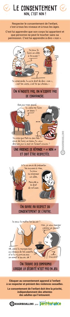 Remettre le consentement de l’enfant au cœur de son accompagnement, c’est lui redonner le pouvoir sur son propre corps, c’est lui redonner son pouvoir de décision, pour lui·elle, et c’est aussi prévenir des violences sexuelles : c’est mon corps, c’est moi qui choisi.