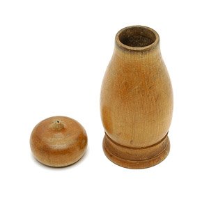 méplat à pans en verre moulé à large goulot droit ourlé avec bouchon en buis tourné monté sur liège percé de deux trous dont un muni d’une soupape en bois. paris 1873 (considéré comme le plus meurtrier en raison de son manque d’hygiène, fut ensuite interdit à la vente) http://www.histoire-du-biberon.com/biberons/biberons3.htm