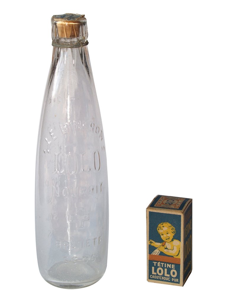 LOLO nourrit + Breveté SGDG inscrit dans la masse sur une face et graduations sur l’autre face (25-225)http://www.histoire-du-biberon.com/biberons/biberons4.htm.