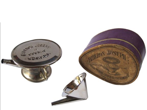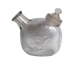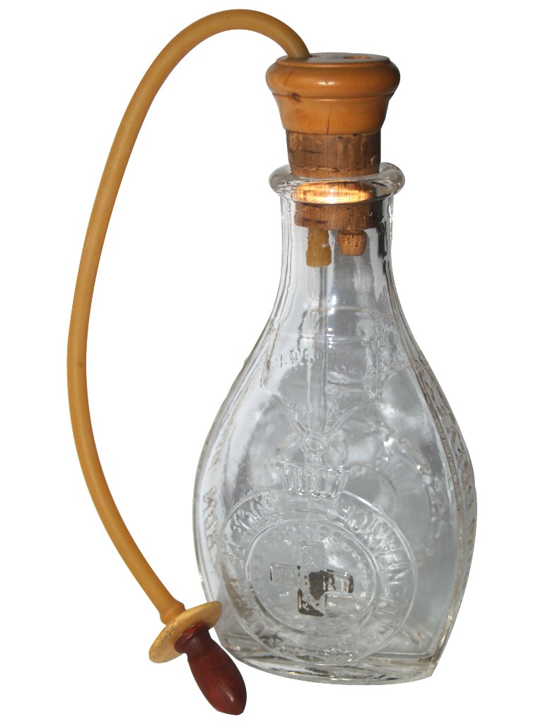 en cristal taillé à prise d’air latérale et bouchon à l’émeri recouvert ‘un trayon de vache. http://www.histoire-du-biberon.com/biberons/biberons2Ter.htm