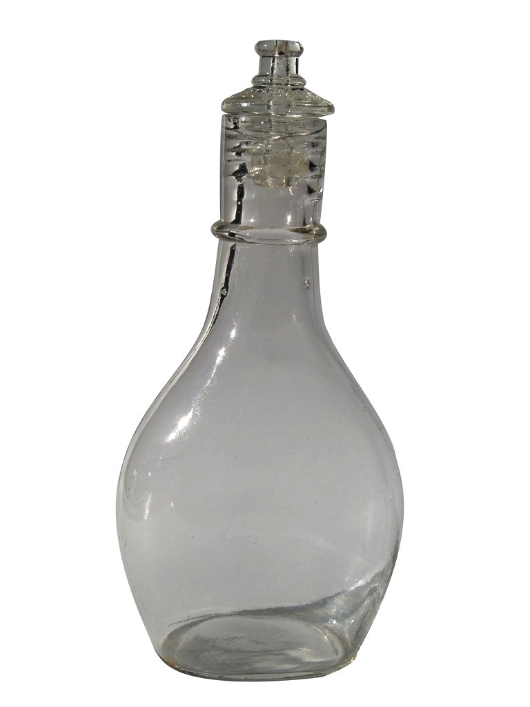 en verre à goulot dressé rodé. Bouchon tétine en buis et ivoire monté sur liège rapporté.(http://www.histoire-du-biberon.com/biberons/biberons2Ter.htm