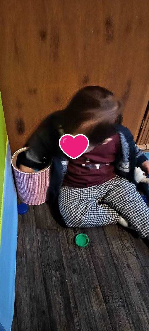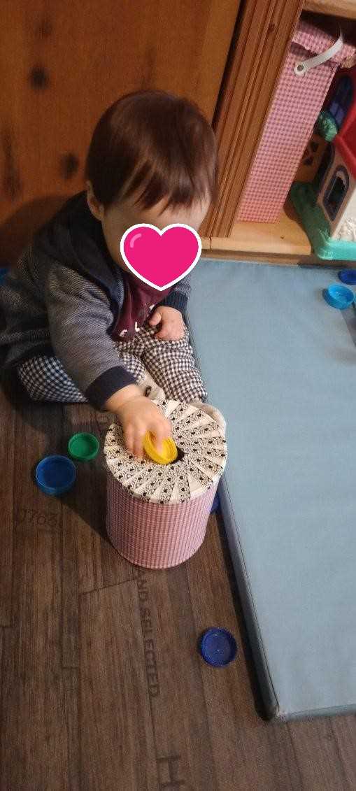 Le fameux jeu des bouchons remplit toutes ces fonctions. Lucas s’est amusé à renverser, à remettre dans la boite une fois, deux fois ,,, et ainsi de suite. Une boite de lait customisée et des bouchons, simple à créer.